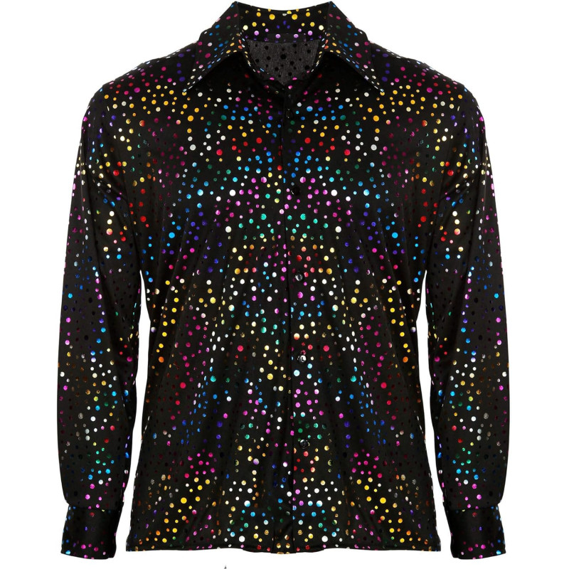 Stylish shirt for men in trendy disco style. The shirt is designed in the eye-catching black color with colorful marbles. The collar and long sleeves provide an authentic look. Put yourself back into the sparkling world of disco balls with this shirt and conquer the dance floor.