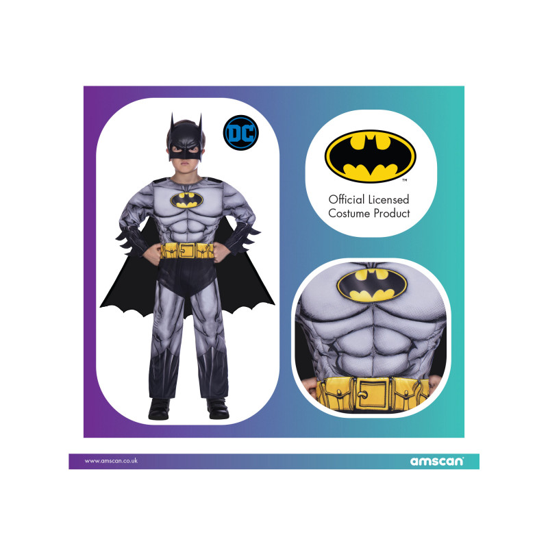 This kids carnival costume is comfortable, elastic and does not restrict movement, making it ideal for active parties and longer wear. The padded chest creates a muscular body effect, while the cape and mask complete the classic Batman look. Made from 100% polyester, the costume is lightweight and easy to care for.