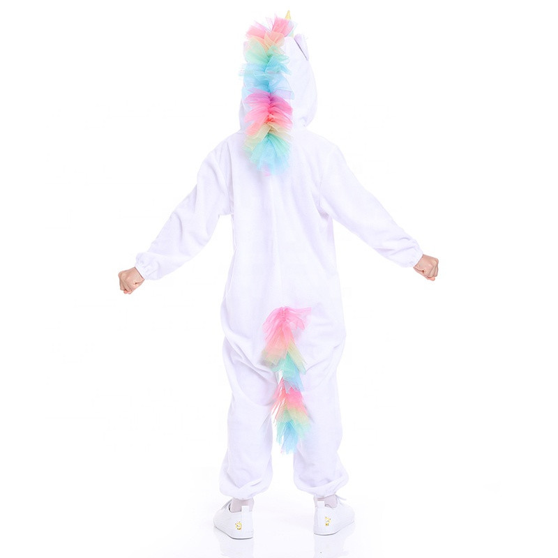 The hood features a unicorn horn and ears, while the back is decorated with a colourful tail that completes the magical look. The loose fit allows freedom of movement, making it ideal for active celebrations and performances.