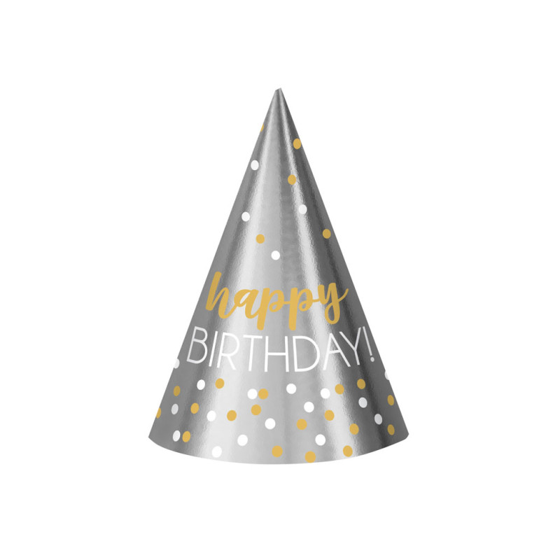 Gimtadienio kepurėlės „Happy Birthday“ – elegantiškos sidabrinės popierinės kepurėlės su auksiniu užrašu, puikiai tinkančios gimtadienio šventėms vaikams ir suaugusiems. Lengvos, patogios ir dekoruotos taškeliais, jos akimirksniu suteikia šventišką nuotaiką ir papuošia bet kurį gimtadienio stalą ar fotosesiją.