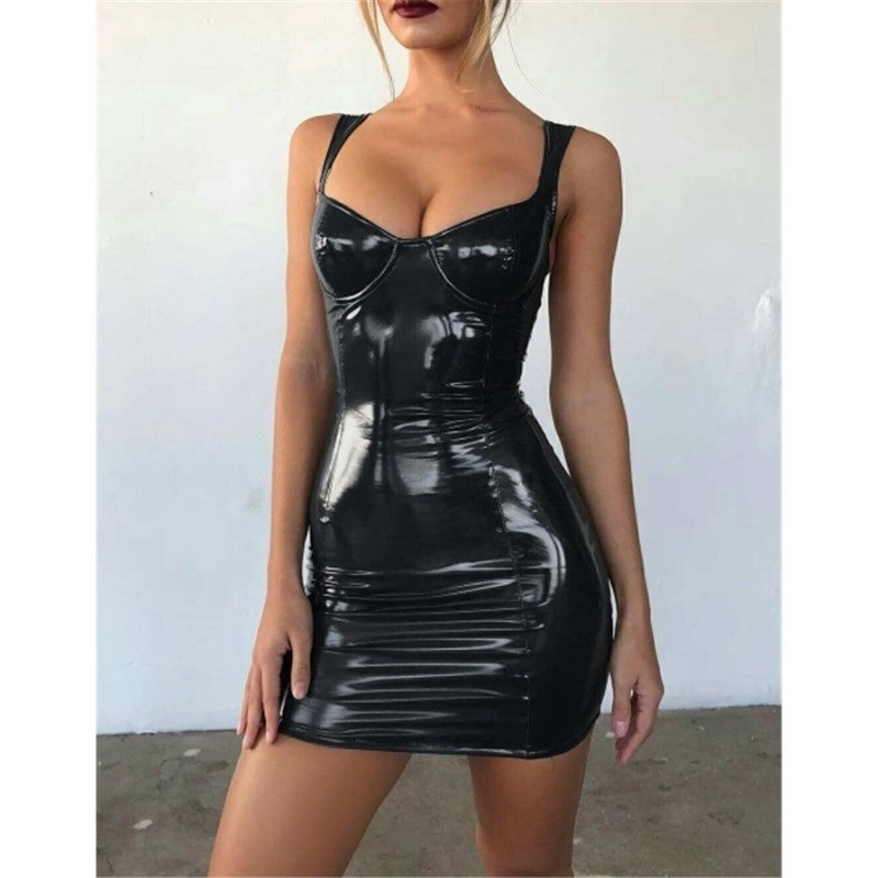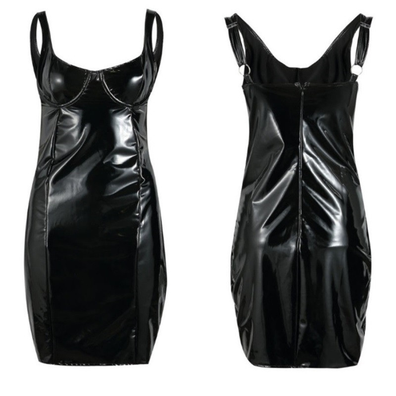 Ši juoda latekso stiliaus suknelė – išskirtinis ir dėmesį traukiantis drabužis, suteikiantis modernų ir gundantį įvaizdį. Blizgus paviršius kuria prabangos įspūdį, o prigludęs siluetas pabrėžia figūros linijas.