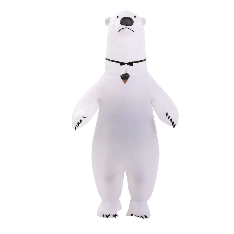 Pripučiamas baltojo lokio kostiumas suaugusiems - linksmas ir įspūdingas kostiumas vakarėliams, Helovinui ar teminiams renginiams. Tinka žmonėms nuo 150 iki 190 cm ūgio. Komplektą sudaro ventiliatorius, kurį galima maitinti 4 AA tipo baterijomis (nepridedamos) arba USB jungtimi.