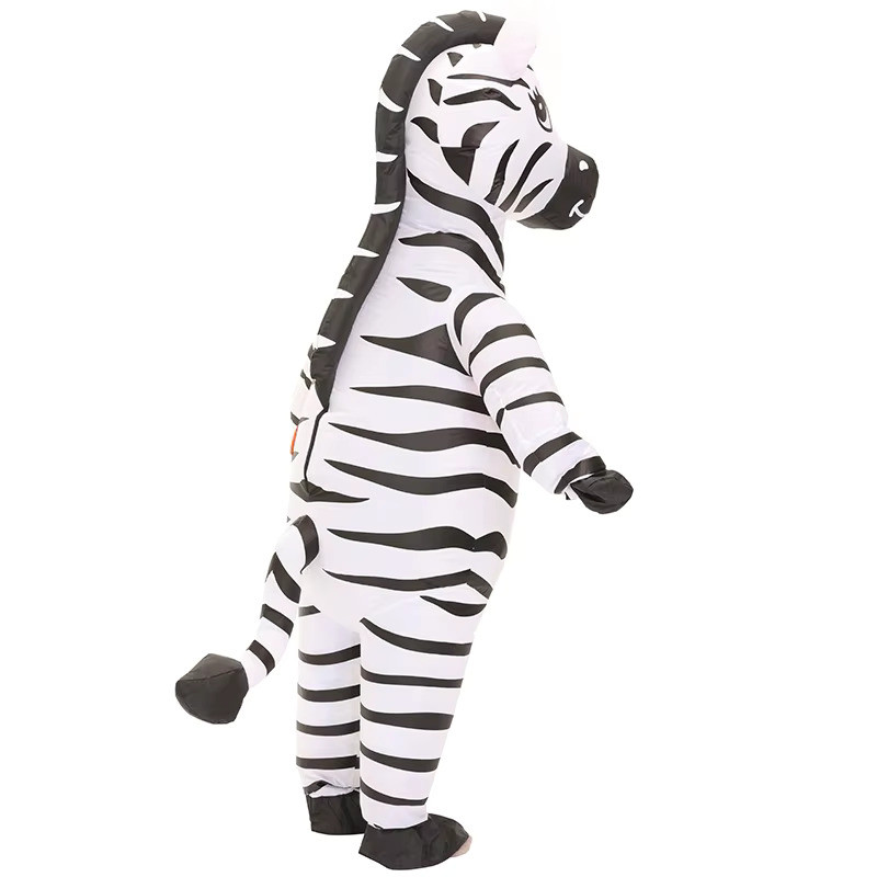Pripučiamas zebrų kostiumas suaugusiems - linksmas kostiumas, leidžiantis tapti zebra. Tinka žmonėms nuo 150 iki 190 cm ūgio. Komplekte yra ventiliatorius, maitinamas keturiomis AA baterijomis (nepridedamos) arba USB jungtimi.
