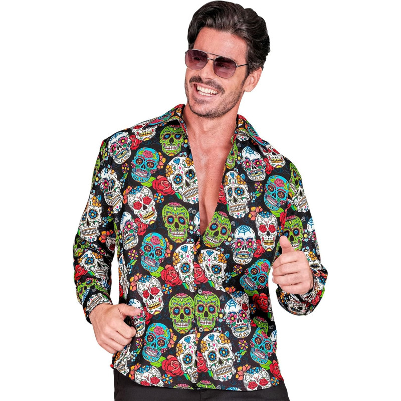 Vyrų marškiniai yra spausdinti juoda spalva ir su daugybe spalvingų kaukolių. Jie turi ilgas rankoves ir apykaklę. Ar tai Helovino renginiai, Mirusiųjų diena ar kiti kostiumų renginiai, šis įvaizdis privers atsisukti.
