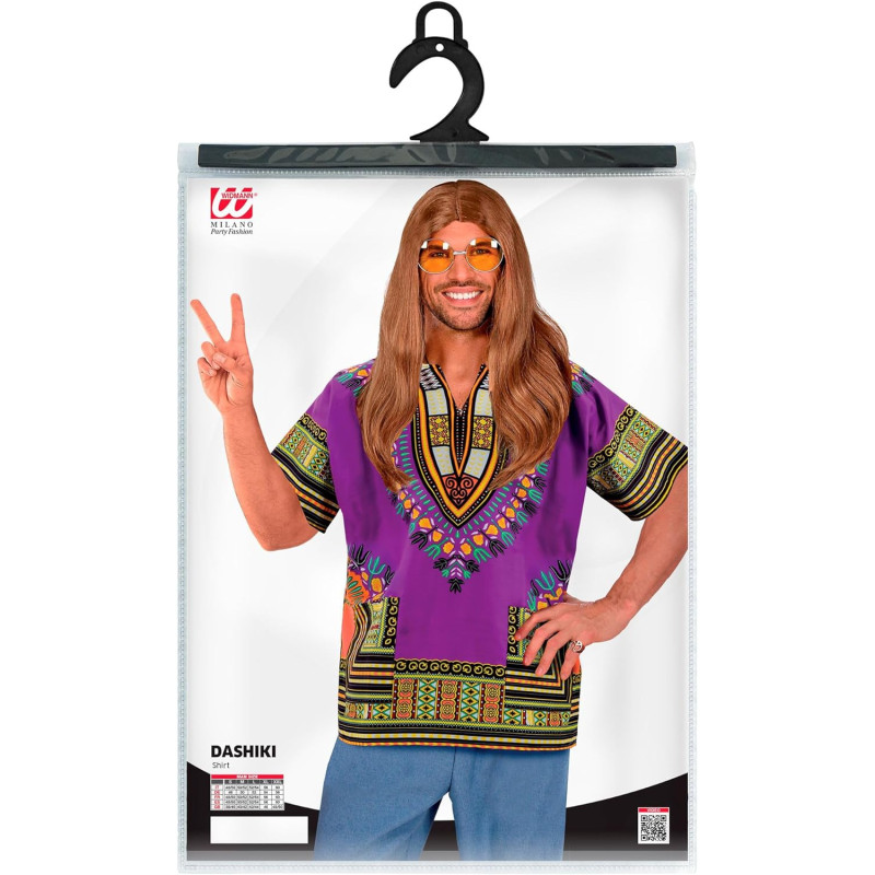With this costume you can transform yourself into an authentic hippie. The t-shirt is designed with short sleeves and a V-neck. It is intricately decorated with colorful traditional West African patterns.