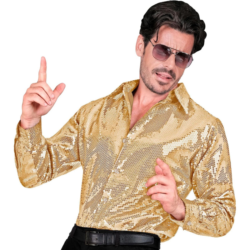 With this shirt you are ready to stand out at the next carnival party. The shirt is equipped with long sleeves and a collar. The entire top is decorated with sparkling gold sequins.