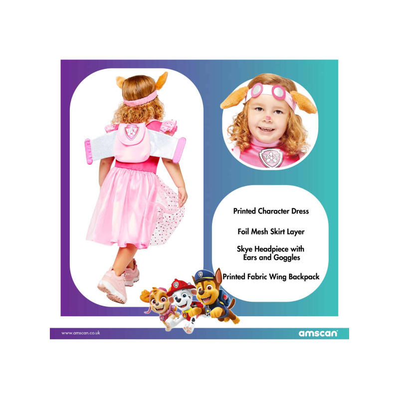Paw Patrol Skye kostiumas vaikams – populiarus pasirinkimas mergaitėms, mėgstančioms animacinį serialą Paw Patrol (Šuniukai patruliai). Atspausdinta personažo suknelė su blizgiu tinklelio sijono sluoksniu, galvos aksesuaras su Skye ausytėmis ir akinukais bei audinio sparnų kuprinė leidžia vaikui lengvai įsijausti į drąsios pilotės šuniukės Skye vaidmenį.