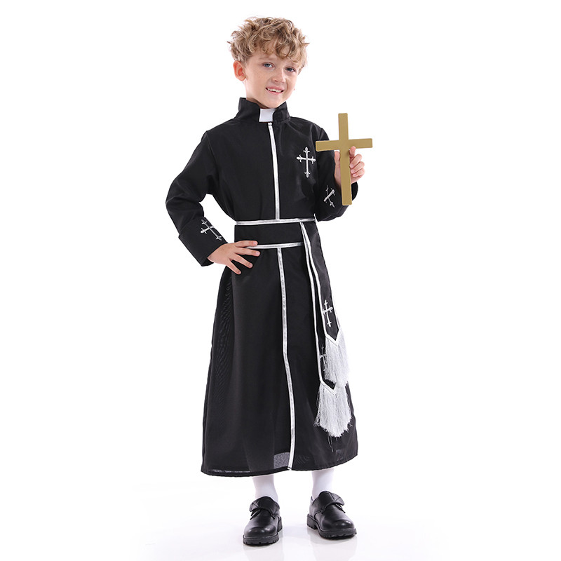 Šis vaikiškas kunigo kostiumas sukurtas pagal tradicinės dvasininko aprangos stilių. Ilga juodos spalvos sutana su baltais detalėmis ir dekoratyviniais kryželiais sukuria atpažįstamą ir autentišką įvaizdį.