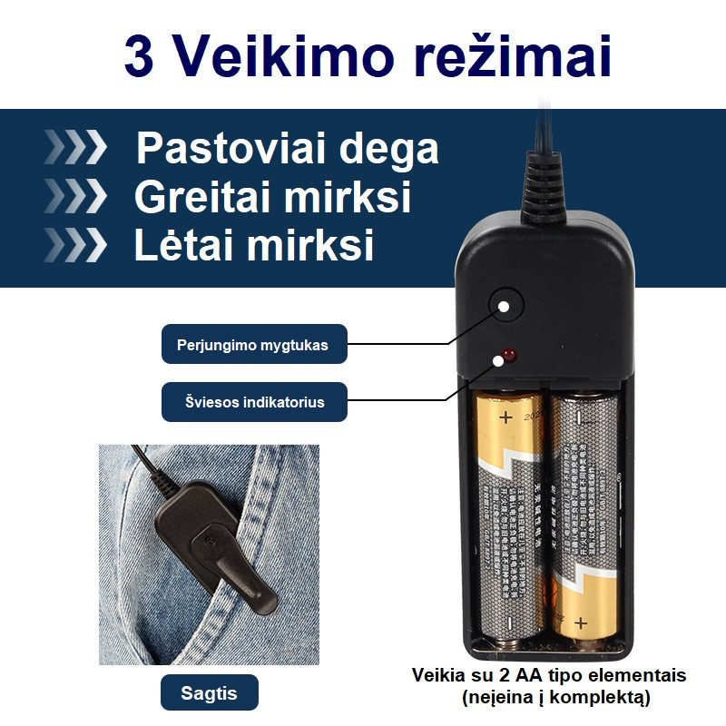 Veikia su 2 AA tipo baterijomis (į komplektą neįeina).