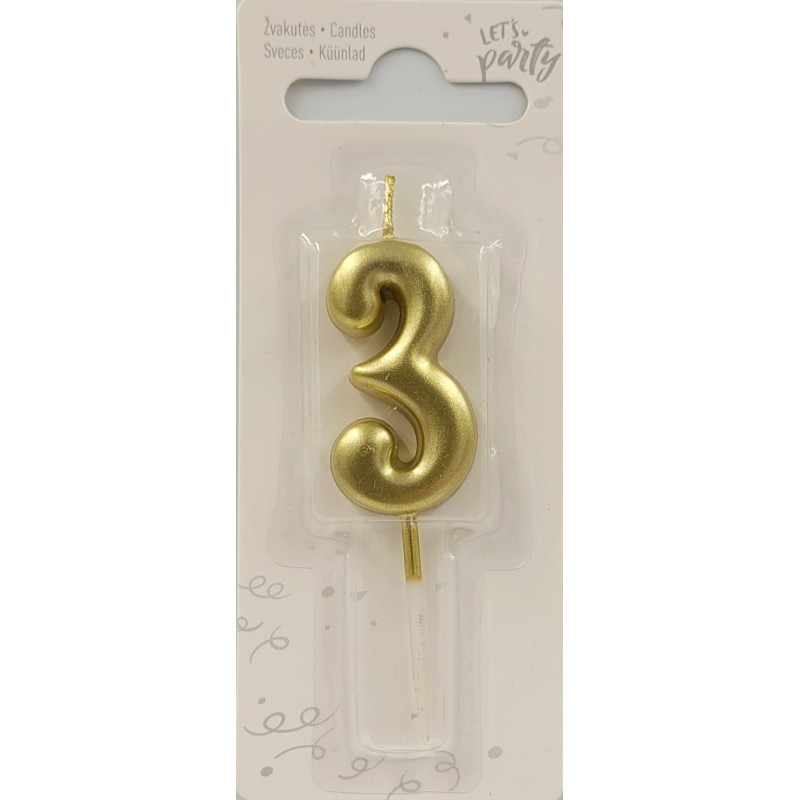 Gimtadienio žvakė, skaičius 3, auksinės spalvos, 1 vnt.