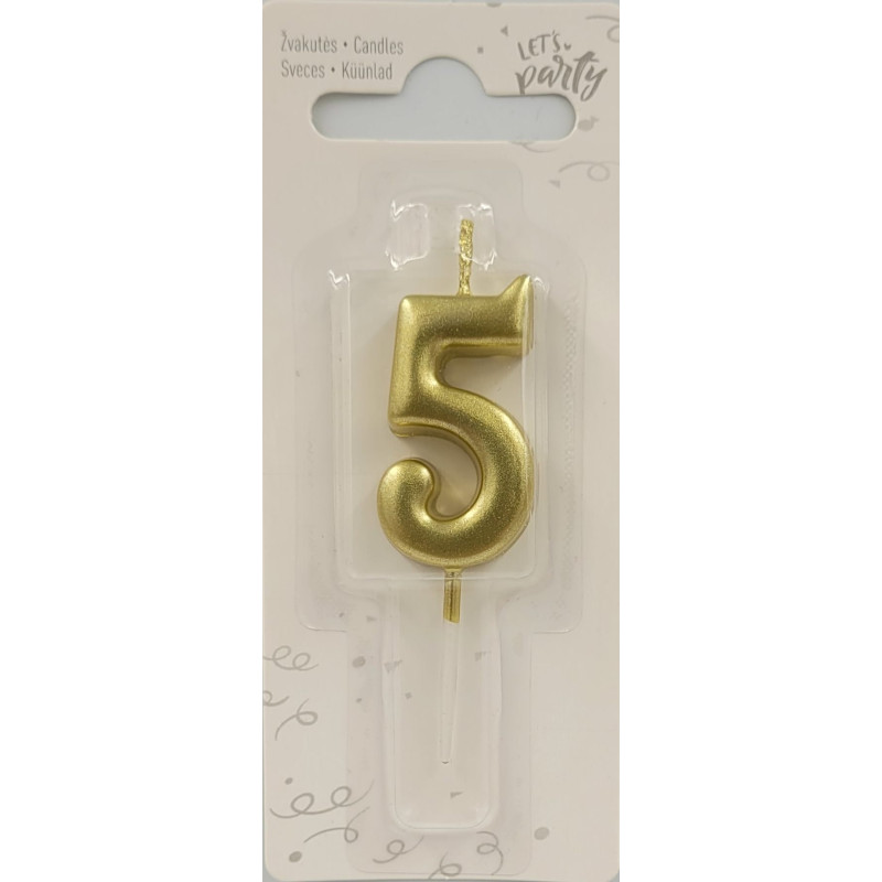 Gimtadienio žvakė, skaičius 5, auksinės spalvos, 1 vnt.