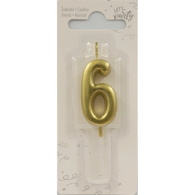 Gimtadienio žvakė, skaičius 6, auksinės spalvos, 1 vnt.