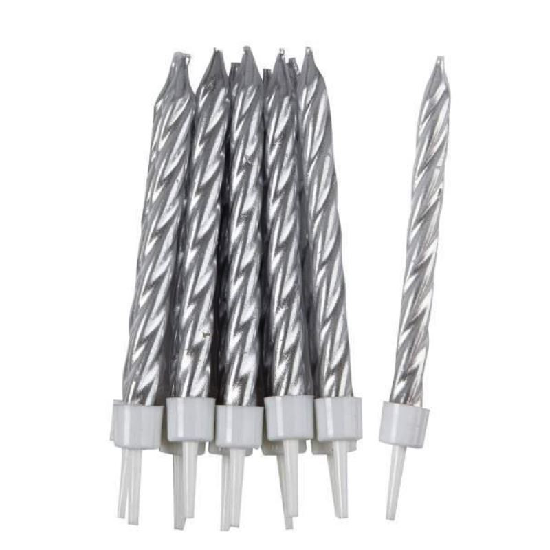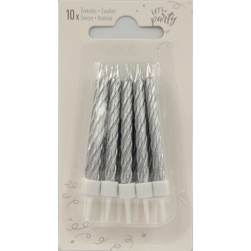 Sidabro spalvos gimtadienio žvakės, 10 vnt. (su plastikiniais laikikliais)