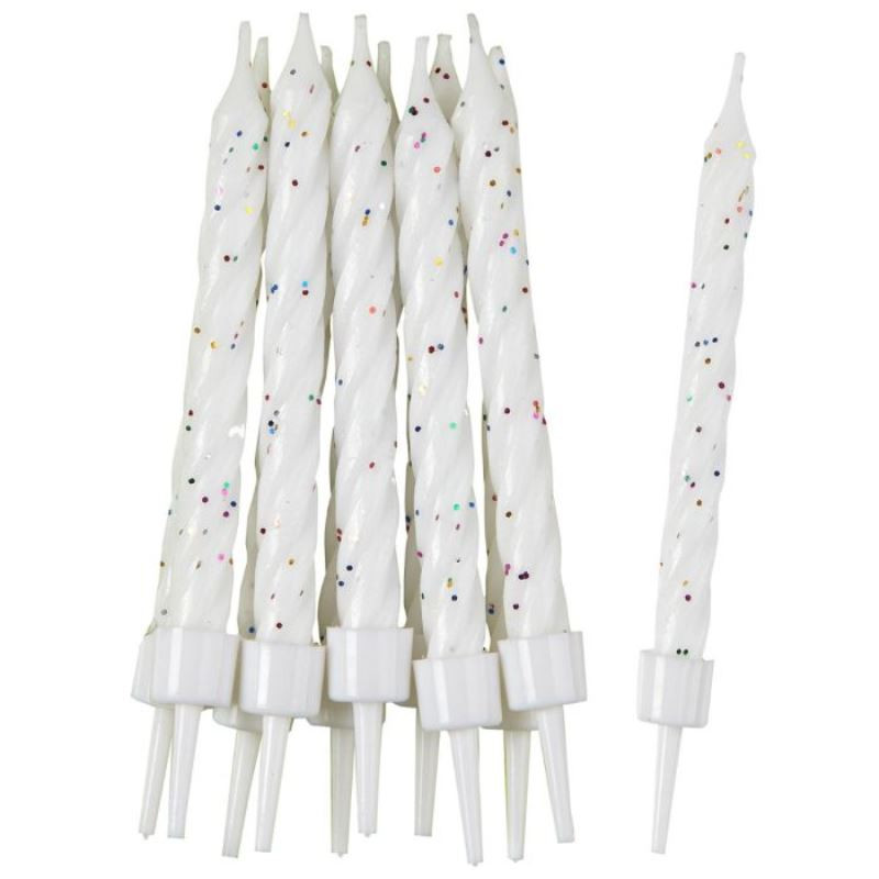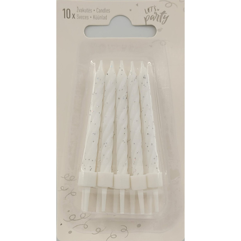 Baltos gimtadienio žvakės, 10 vnt. (su plastikiniais laikikliais)