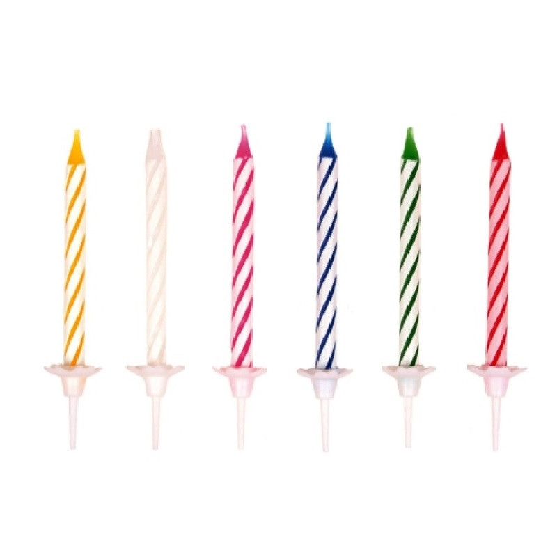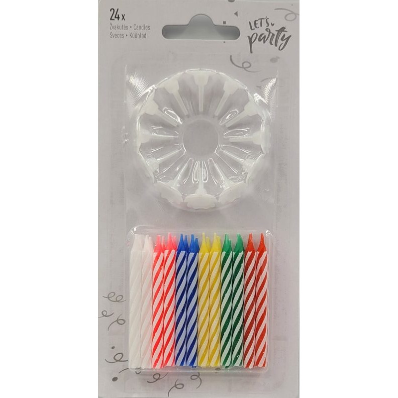 Spiralės gimtadienio žvakės įvairių spalvų: 24 vnt. (su 12 plastikiniais laikikliais).