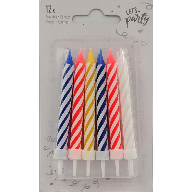 Spiralinės žvakės įvairių spalvų, 12 vnt. (su 12 plastikiniais laikikliais).